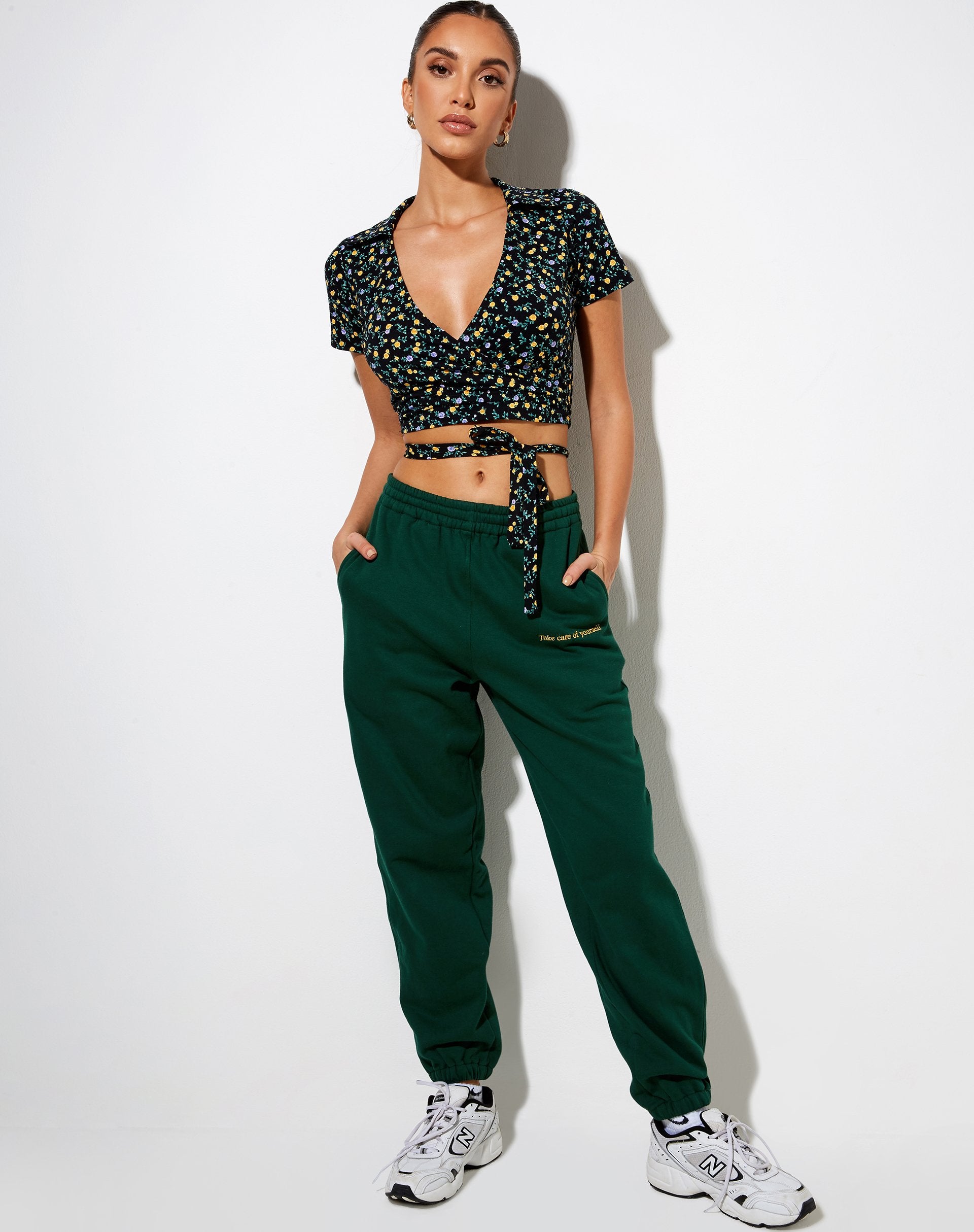I fiori sono sempre una stampa vincente, quindi assicuratevi di aggiornare il vostro con il fiore che scorre. Il Bilar topnei colori nero, blu e giallo, è caratterizzato da un taglio corto con scollo a V, collo a revers e dettagli a cravatta. Abbiamo abbinato il nostro con il jogger Basta.
