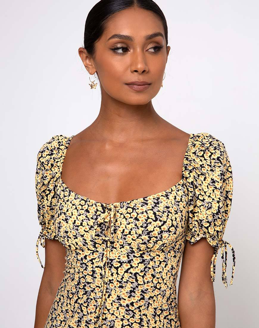 Sbocciare in primavera con il nostro abito Cello. L'abito ultra femminile midi in una classica stampa floreale. Caratterizzato da una lusinghiera scollatura quadrata increspata, maniche a taglio con dettaglio di cravatta e un elegante spacco laterale. Abbinatelo a una graziosa borsa di paglia e a scarpe da ginnastica per un look disinvolto ma chic.