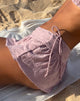 Super mini micro sfacciato gonna a vita bassa, elasticizzata e con un profondo pannello in vita, rifinita con un orlo a balze e con una copertura limitata in broderie rosa blush. nuotata tessuto. Da abbinare al nostro top bikini top bikini Pami abbinato.