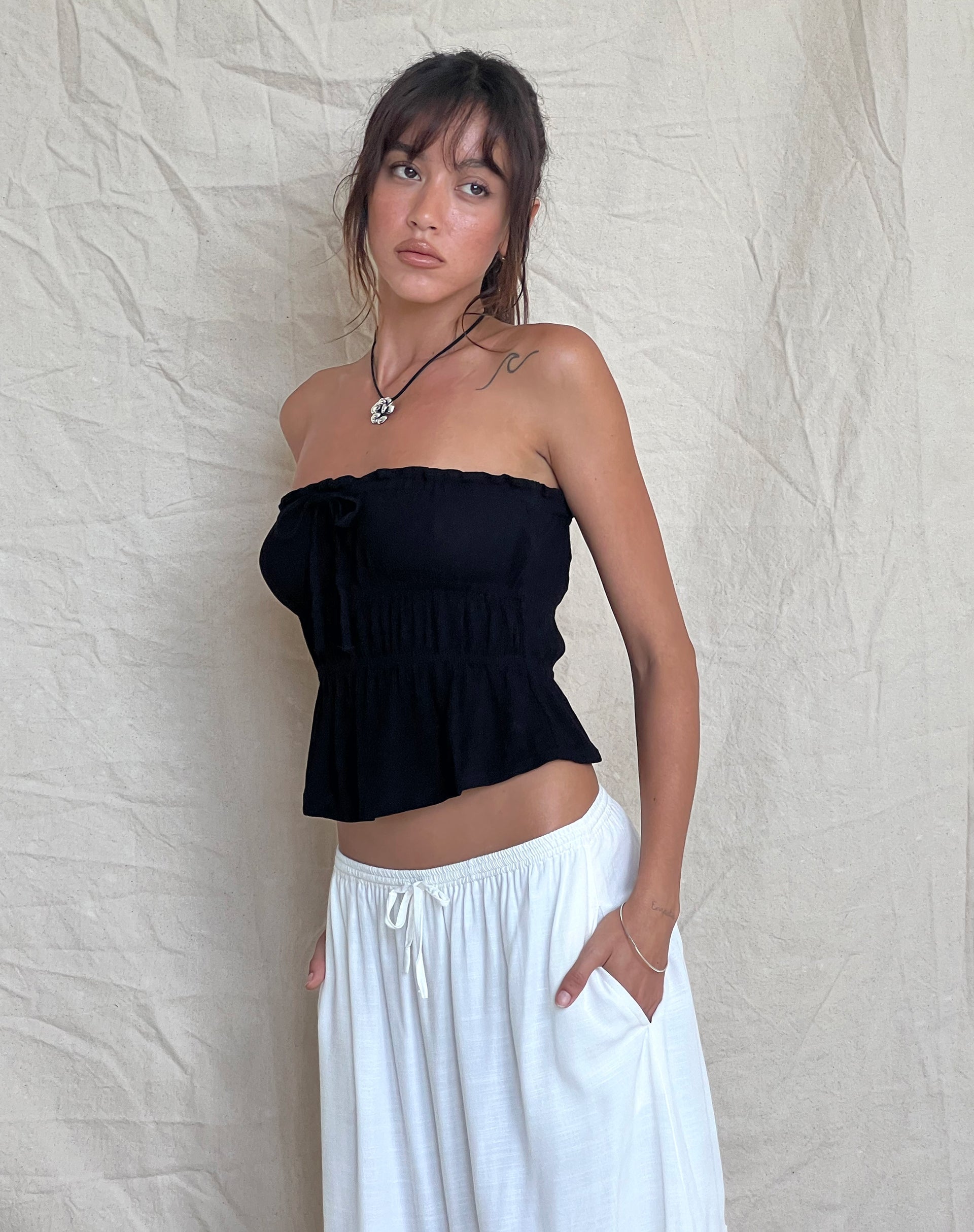 In un tessuto nero increspato e non elasticizzato, il top di Cove Cove è caratterizzato da una fascia senza maniche a fascia senza maniche, con dettagli increspati sotto il seno e in vita e un orlo ampio con laccetti funzionali sulla scollatura.