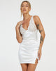 Fate girare la testa con il nostro abito Deralina abito in bianco. È caratterizzato da una finitura satinata, scollatura a V, spacco laterale e vestibilità mini. vestibilità mini. Completate il tutto con un paio di tacchi e una pochette per una serata perfetta.