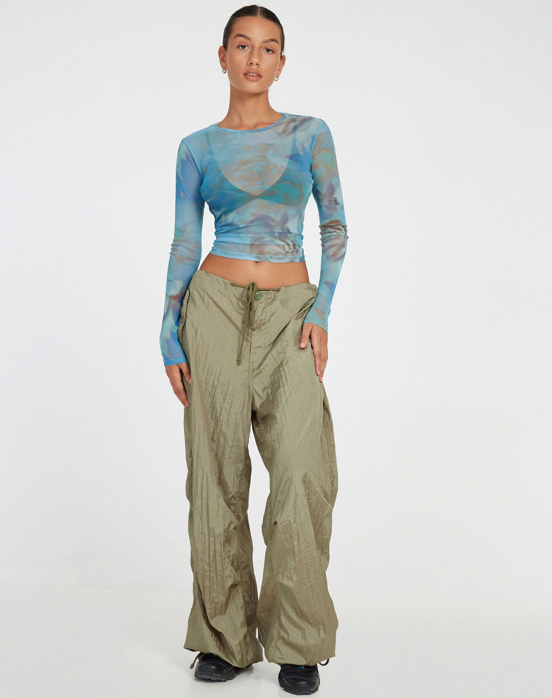 Riempite la vostra collezione di maglie per la stagione estiva! Il nostro Elijah topin blu petalo digitale, presenta una scollatura a girocollo, maniche lunghe e una finitura a rete. Da abbinare a una bralette nera e al nostro Chute pantaloni.