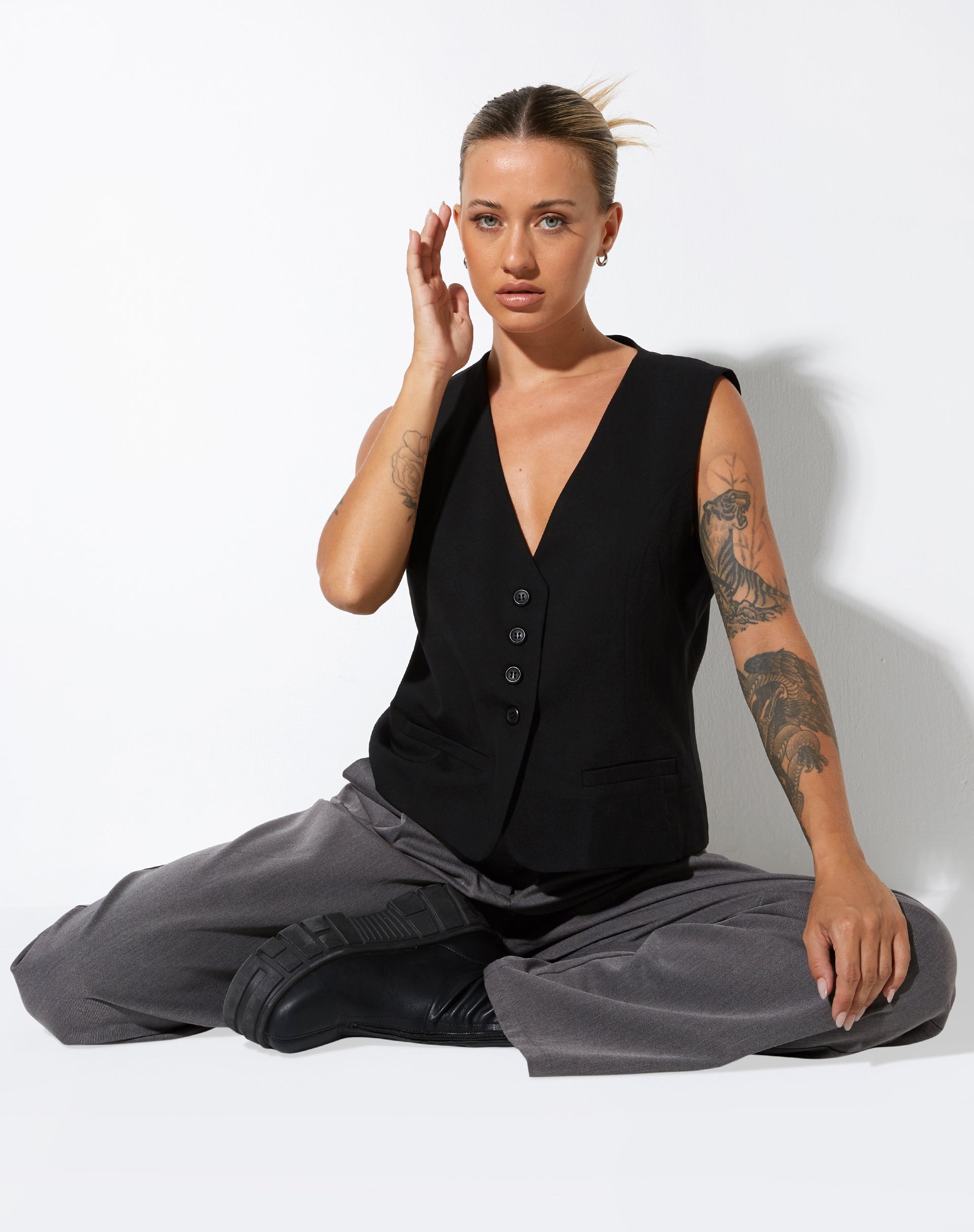 Il nostro Gavan aggiungerà sicuramente un tocco sofisticato, sartoriale sartoriale al vostro abbigliamento. In nero, questo gilet gilet è senza maniche, con scollo a V e chiusura a bottoni. Da abbinare ai pantaloni pantaloni Abba in grigio e stivali neri spessi.