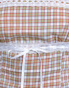 Il Kaita Top in morbido tessuto sartoriale a quadri rossi, presenta coppe arricciate e un nastro giallo sotto il seno. È dotato di lacci sulle spalle per una vestibilità regolabile e di una cerniera invisibile con cuciture laterali per facilitare l'ingresso. Da abbinare alla gonna Nidya .