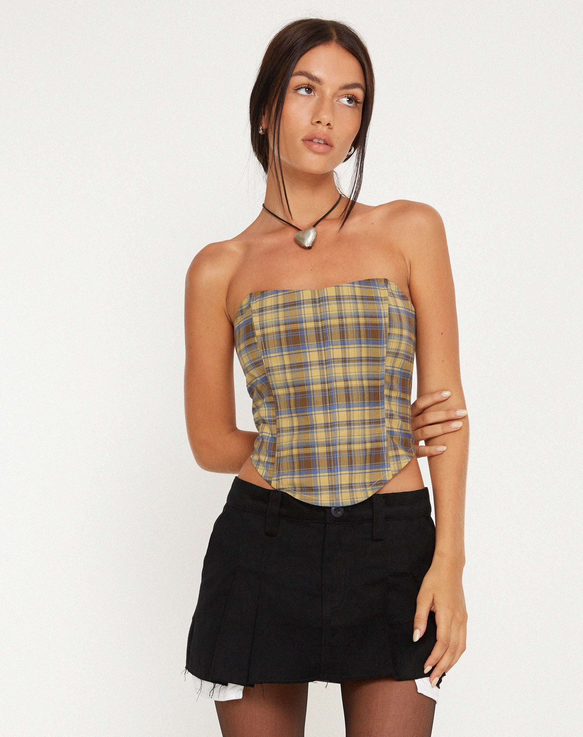 Il nostro corsetto su misura corsetto è disponibile in una stampa a quadri blu e gialli giallo blucon vestibilità senza spalline e chiusura a zip al centro della schiena. Ci piace abbinarlo al nostro Blythe con la nostra gonna Blythe.