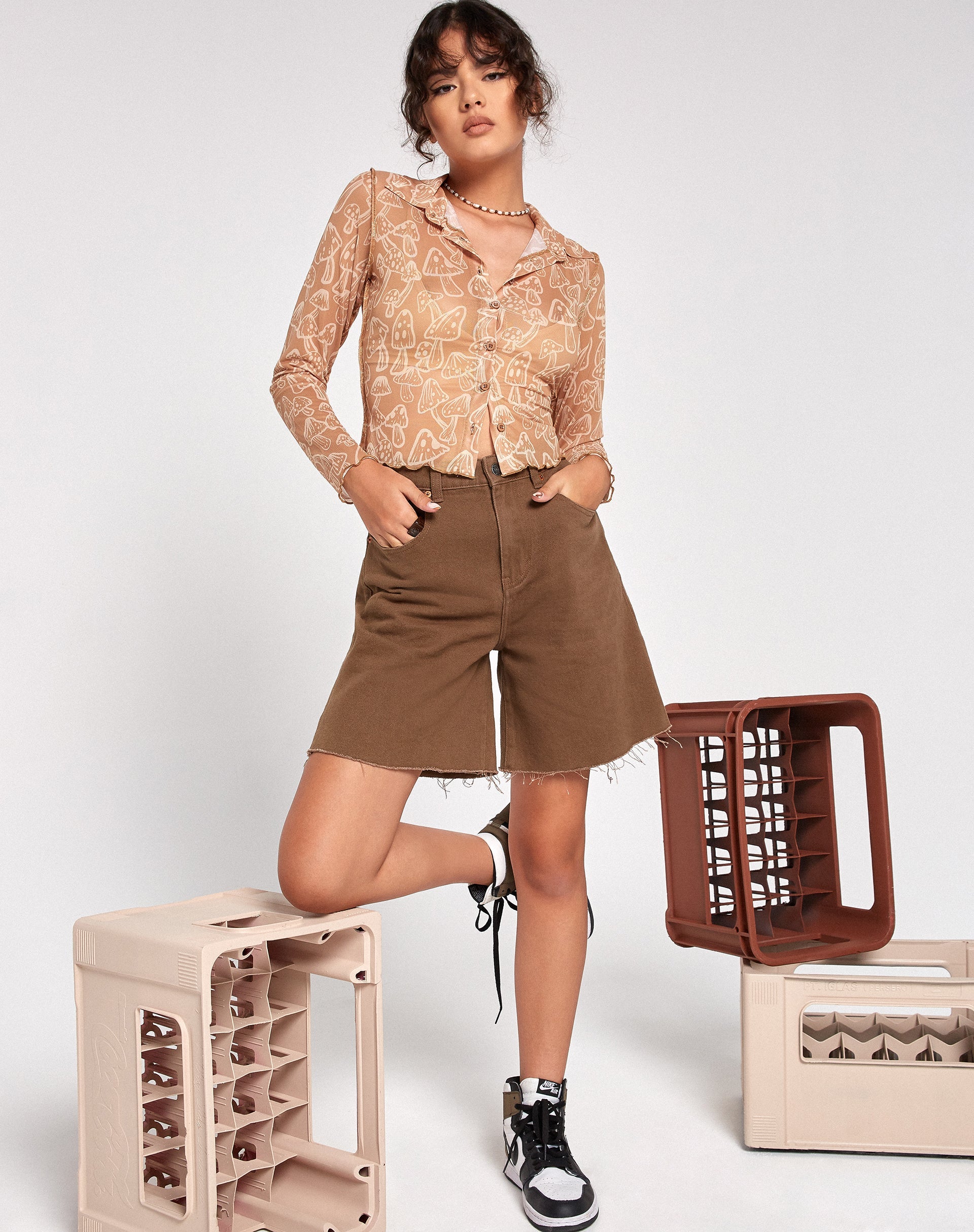 Aggiungi una nuova stampa al tuo guardaroba con la nostra camicia Keyla. Con maniche lunghe e abbottonatura frontale e colletto in stampa a fungo color cuoio. L'abbiamo abbinata ai pantaloncini in denim Loose Fit in marrone intenso.