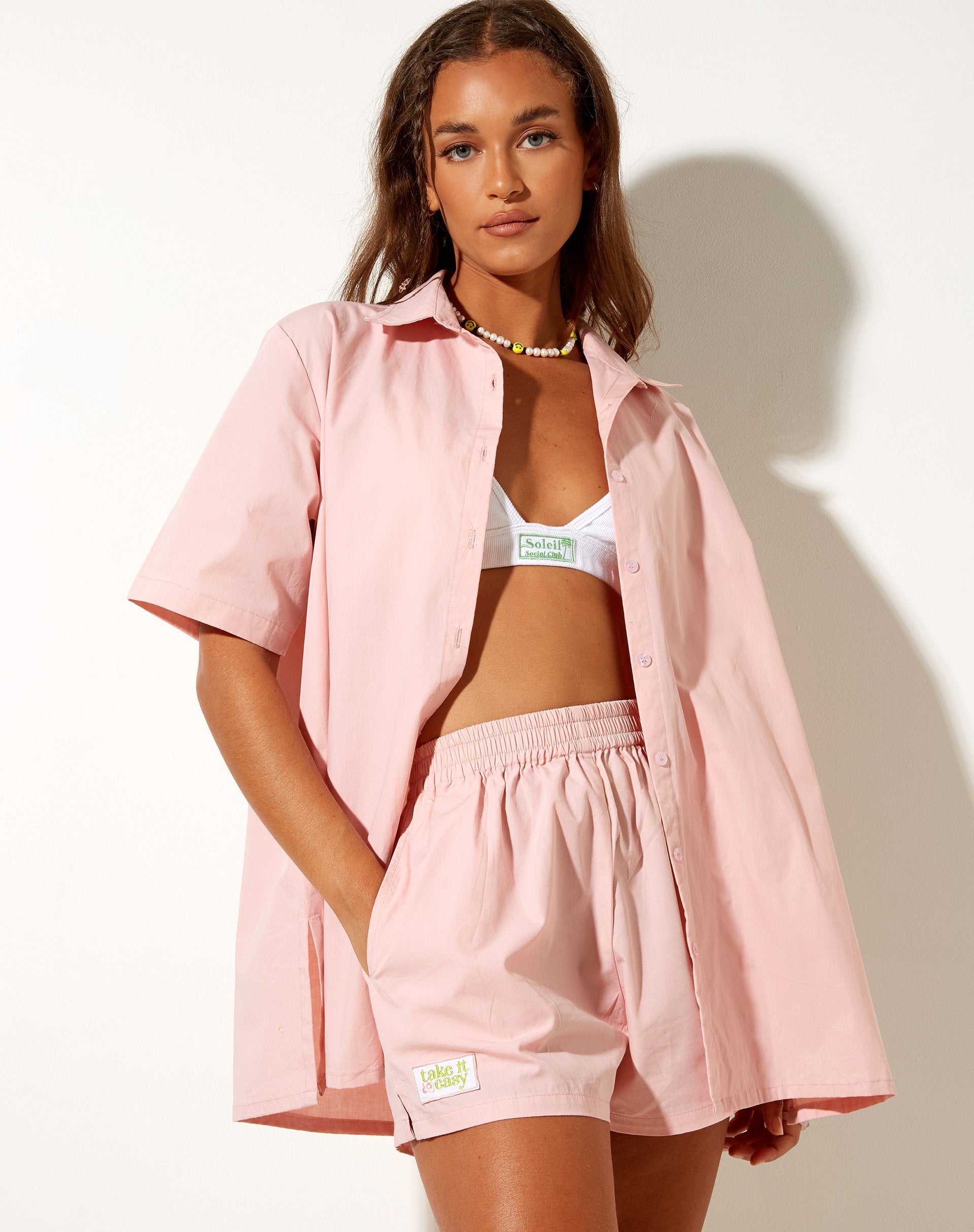 Aggiungete un tocco di rosa al vostro look con i nostri Lala pantaloncini. Caratterizzati da una lunghezza corta, vita alta ed elasticizzata in rosa con etichetta "Take It Easy" ricamata. Da abbinare alla camicia Smita in rosa. Smita in rosa.