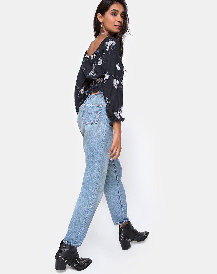 Il top Lancer porta con sé un'atmosfera gitana. Carino e casual, presenta una stampa floreale monocolore in bianco e nero, maniche lunghe a campana, scollatura fuori dalla spalla e orlo arricciato. Aggiungete molti gioielli e uno stivale western per completare il tutto.