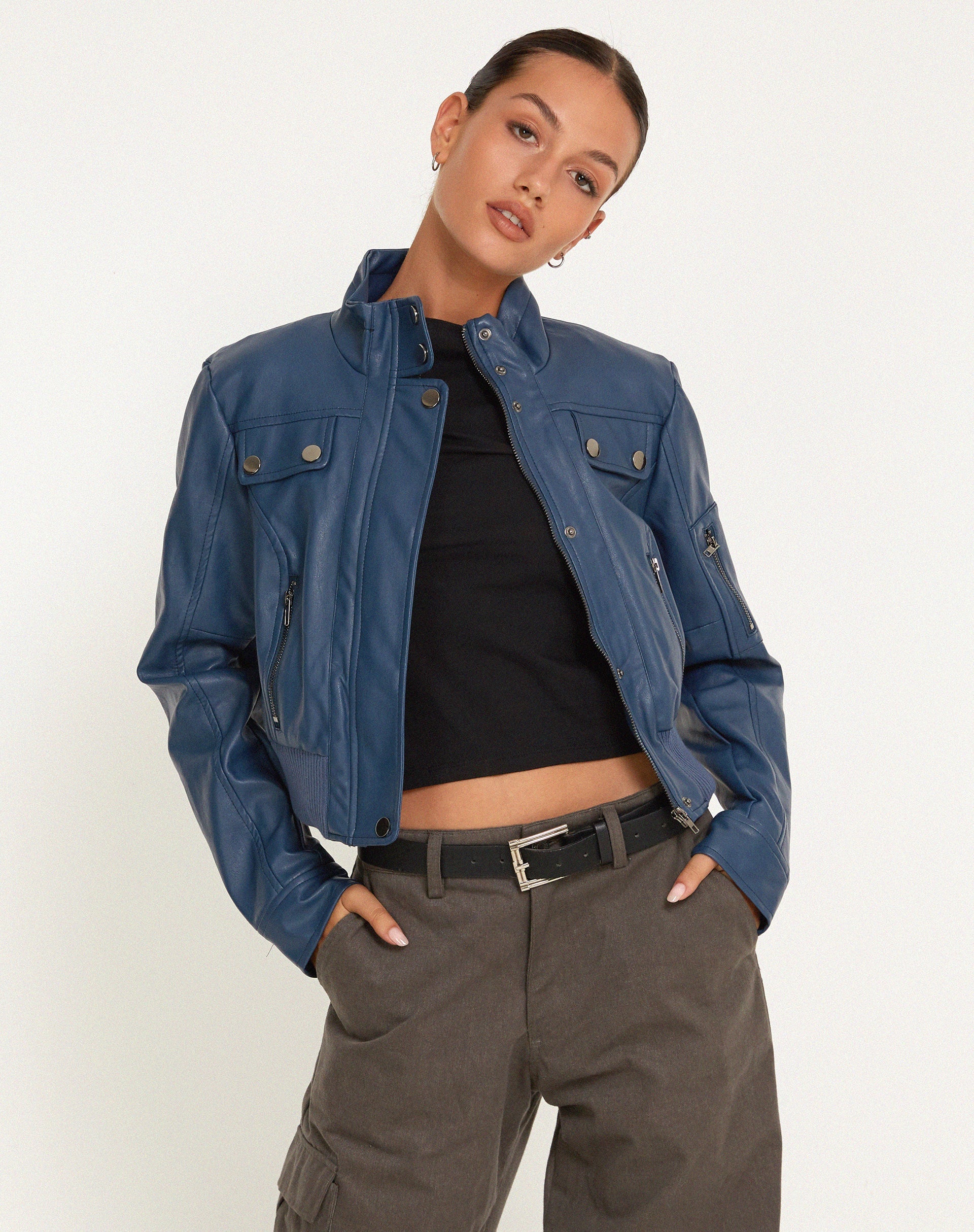 La vostra collezione A/I non è completa senza la nostra giacca Loviana. Loviana. In PU blu navy, presenta un collo alto con chiusura a bottoni, dettagli con zip e maniche lunghe. Completate il look con la nostra Shan pantaloni.