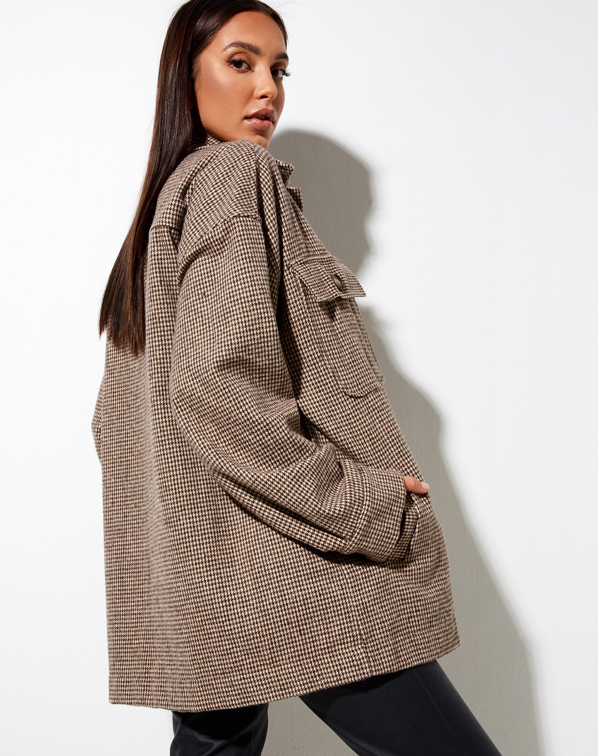 Mantenete il vostro stile con la camicia Marcel perfetta per una vestibilità transitoria. Perfetta per un abbigliamento transitorio, ha una vestibilità oversize con maniche lunghe, colletto con risvolto e dettagli delle tasche, in una stampa pied-de-poule marrone. Indossatela aperta sopra una t-shirt di base con i jeans jeans paralleli e uno stivale grosso.