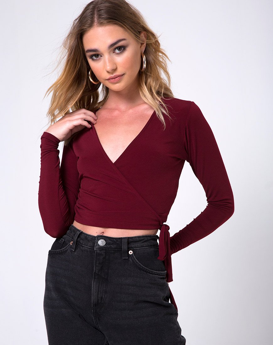 Il top Marche vi permetterà di essere pronte a tutto con questo capo essenziale per tutti i giorni. In un caldo bordeaux, presenta una vestibilità cropped bodycon con maniche lunghe, scollatura a tuffo e avvolgimento frontale completo di laccetti laterali. Completate qualsiasi outfit con questo top non così semplice, semplice.