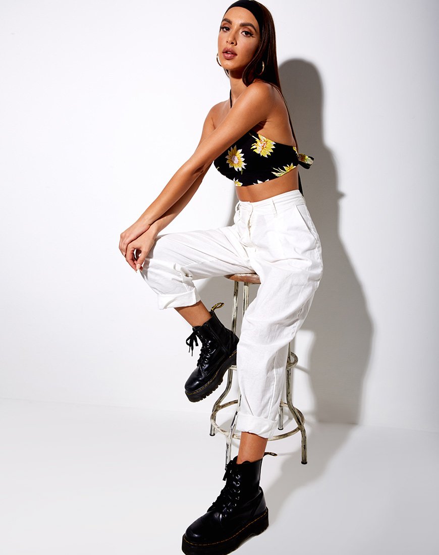 Ravviva il tuo guardaroba con il nostro Maudy top. In una fantasia floreale nera e gialla, è caratterizzato da un taglio bodycon cropped con scollo a farfalla e schiena scoperta da annodare. Mantenete lo stile chic con i nostri pantaloni Misca.
