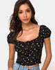 Mantenere il floreale in fiore con il nostro top Mazu! Questo simpatico raccolto presenta un grazioso disegno nero a petali, una scollatura a cuore e maniche corte a sbuffo. maniche corte a sbuffo. Da indossare con i mom jeans e delle Dr Martens per un'atmosfera da ragazza grunge.