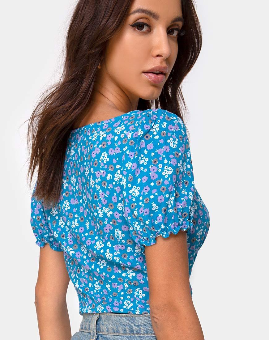 Oh baby! Questo fiore blu baby Monda è un capo essenziale per il guardaroba. scollatura a cuorecon maniche a palloncino e un taglio corto. ritagliato abbottonato. Per rendere questo look più casual, aggiungete degli stivali da cowboy bianchi o delle scarpe da ginnastica e i nostri mom jeans con lavaggio blu.