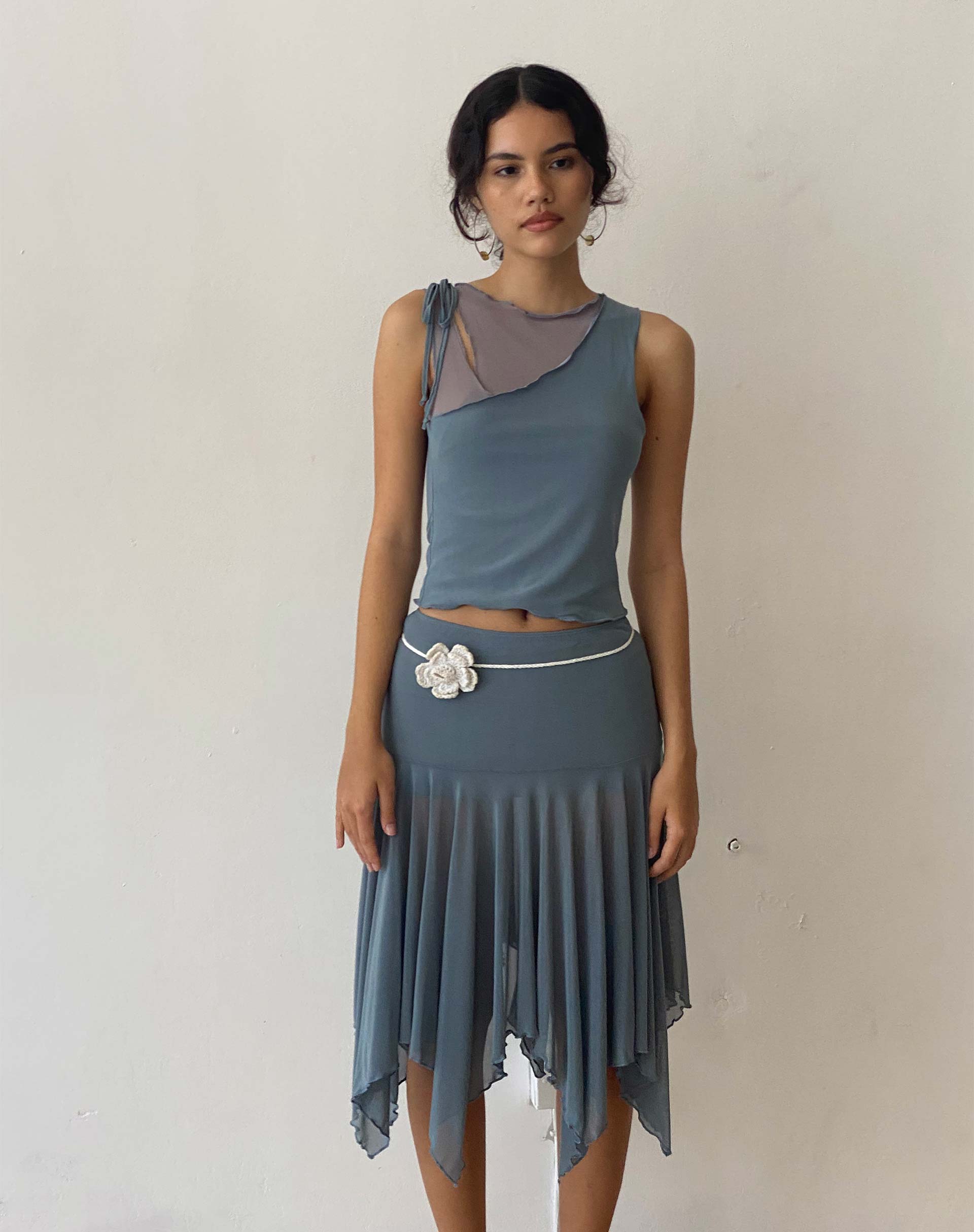 Per ravvivare il vostro look, il top senza maniche Moni senza maniche in grigio blu. Questa canotta è caratterizzata da una sovrapposizione di rete e da una vestibilità vestibilità crop e un dettaglio asimmetrico sulle spalle.
