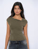 Il Nadja top in tessuto eco cupro color kaki, è caratterizzato da arricciature sul punto del collo, maniche a giro e orlo regolare. Da abbinare a una minigonna in denim.