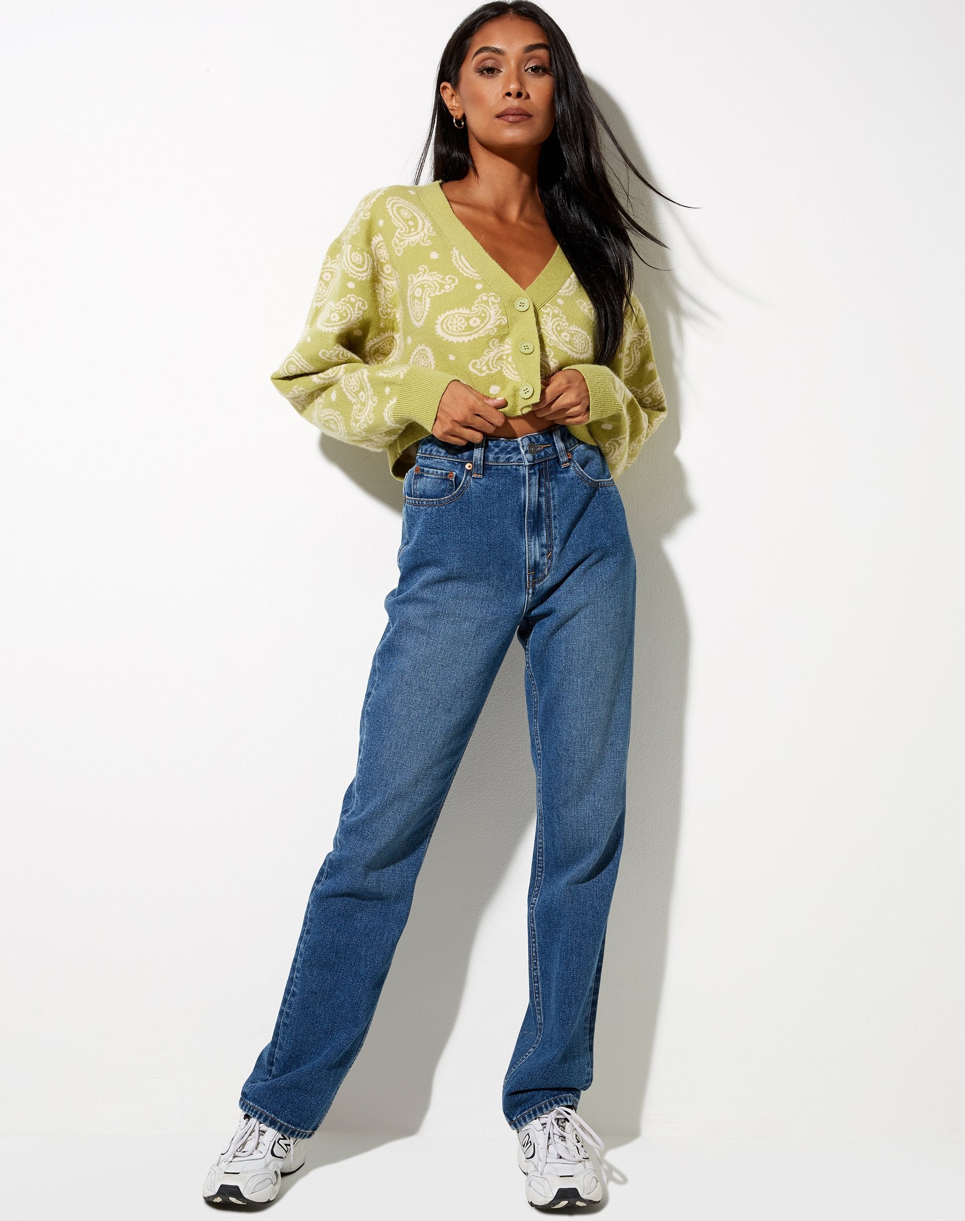 Aggiornate la vostra maglieria con il nostro cardigan Olina cardigan. Caratterizzato da vestibilità cropped, scollo a V e maniche lunghe con una stampa in stile notte persiana color salvia. Completate il look con i jeans Jess in lavaggio medio e le vostre scarpe da ginnastica preferite.