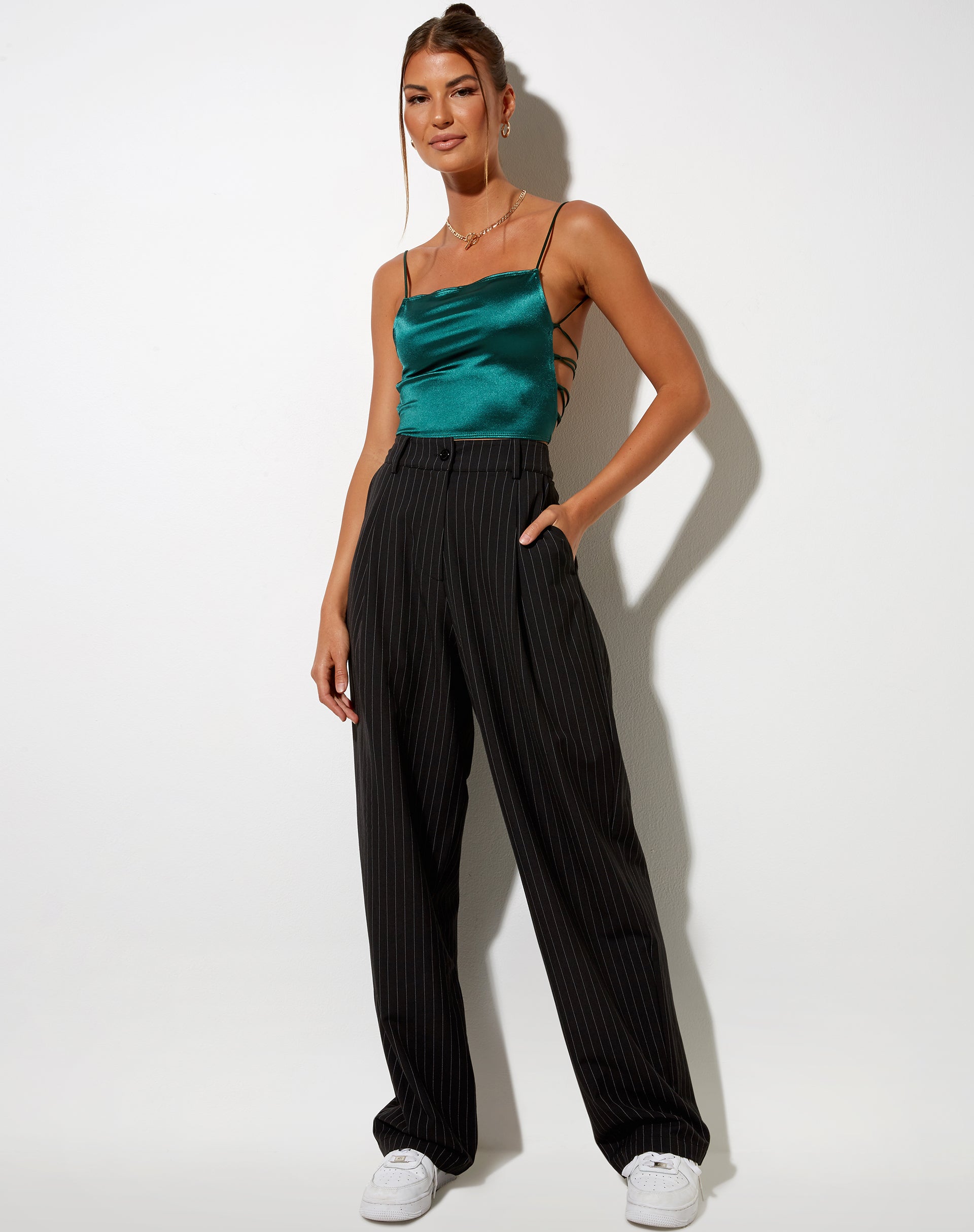 Aggiungete un tocco di raso al vostro guardaroba con il top Ozka. In raso verde bosco, presenta un taglio bodycon taglio con schiena aperta e cinturino incrociato. Abbinatelo ai Sakila in gessato nero e scarpe da ginnastica. e scarpe da ginnastica.