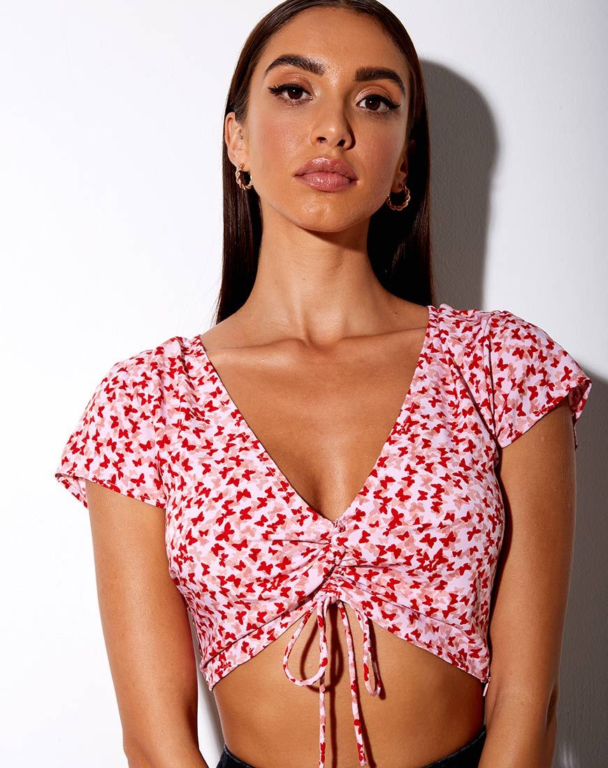 Raeto Crop Top in Ditsy Butterfly Pesca e Rosso