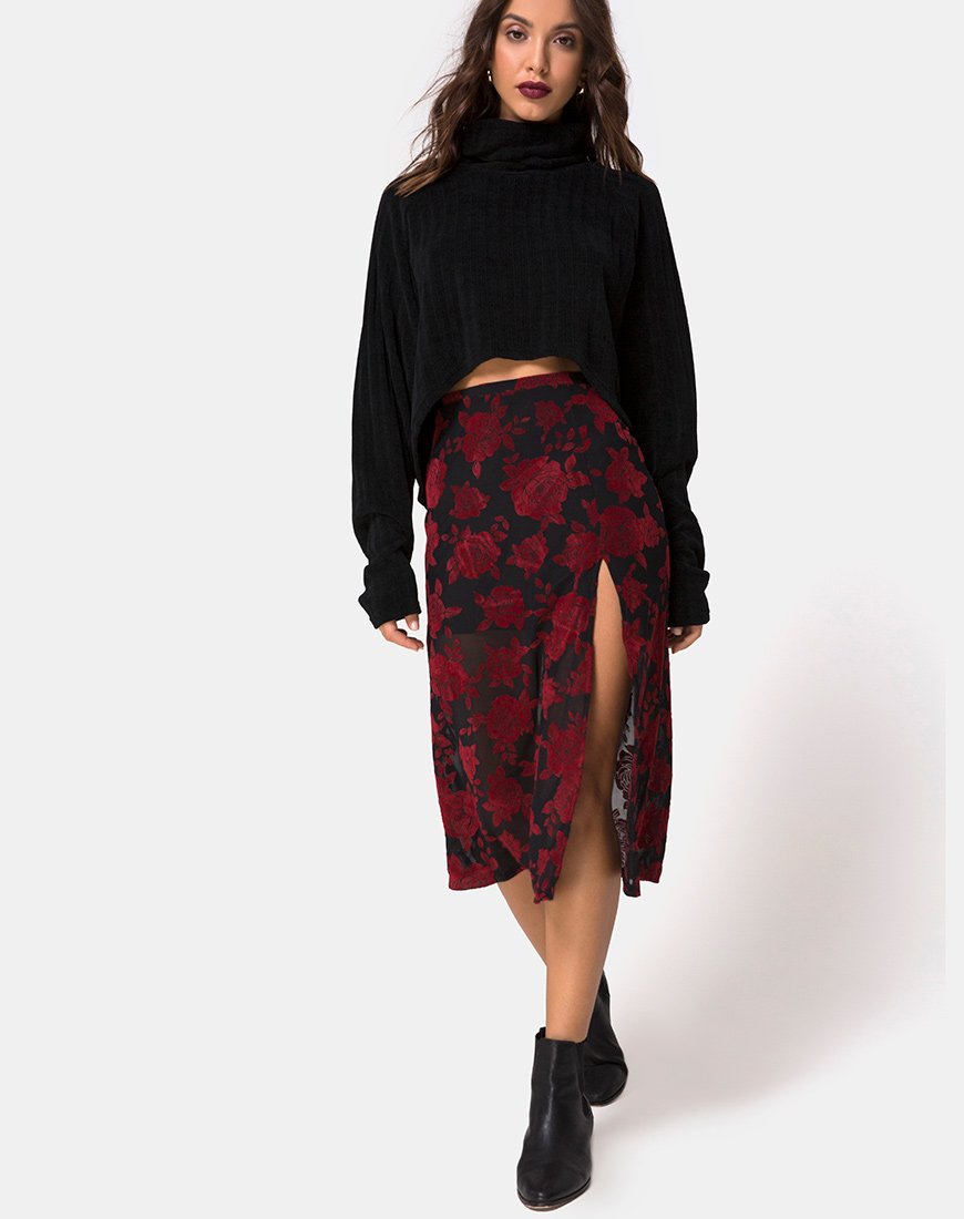 Qui al Motel siamo ossessionati dal floreale, quindi perché non provare la nostra Saika Gonna? Con l'intramontabile stampa floreale di cui il vostro guardaroba ha bisogno! È caratterizzata da una vita alta con midi e spacco laterale in rete nera con dettagli di rose. Per le giornate più fredde, abbinatelo a una maglia grossa e a degli stivali.