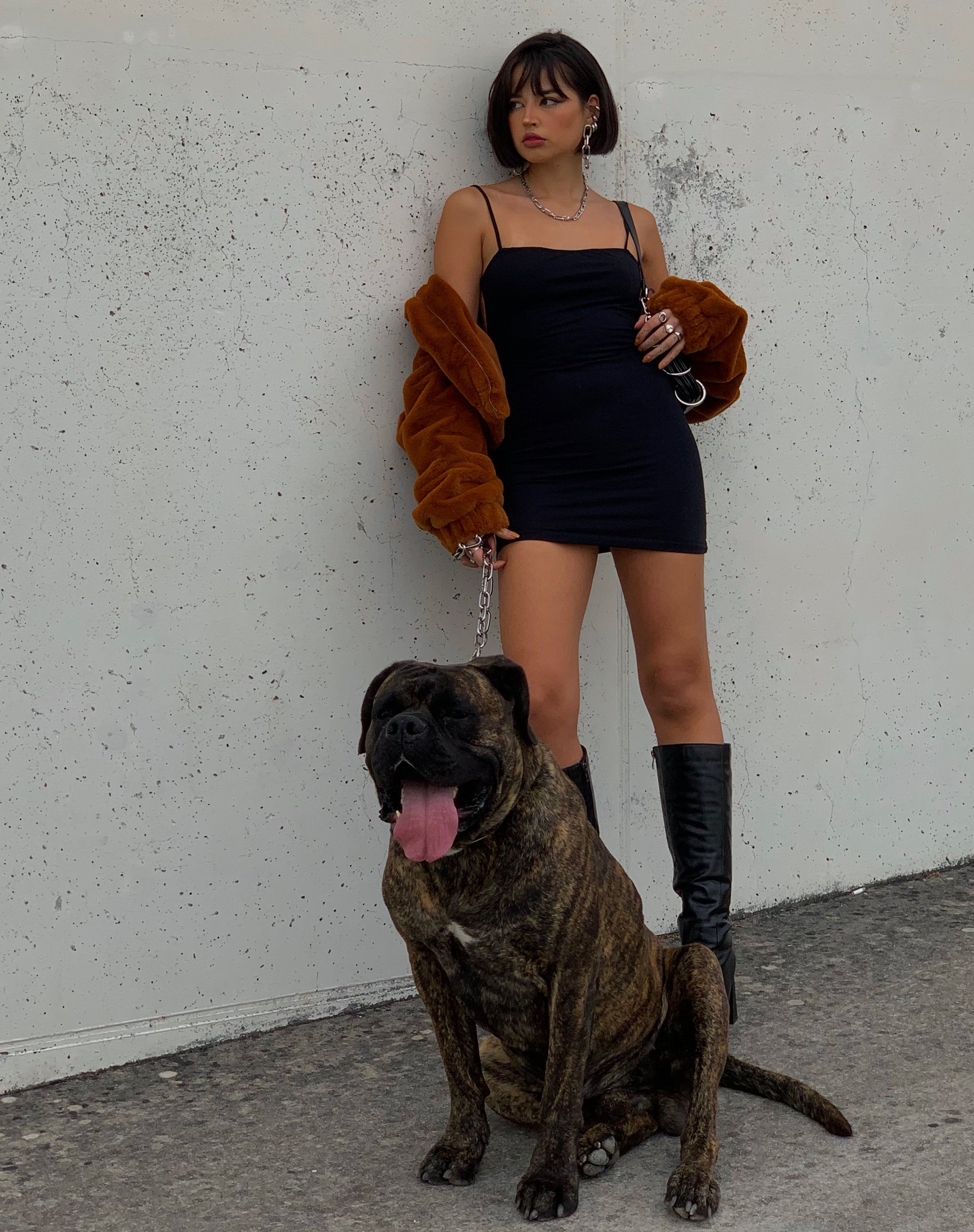 Il nostro Sambre mini abito è perfetto per ogni occasione. In lycra nera, presenta spalline sottili, schiena scoperta e vestibilità bodycon. vestibilità bodycon. Abbinatelo con il vostro paio di tacchi preferiti e indossate la nostra giacca Atsa in marrone.