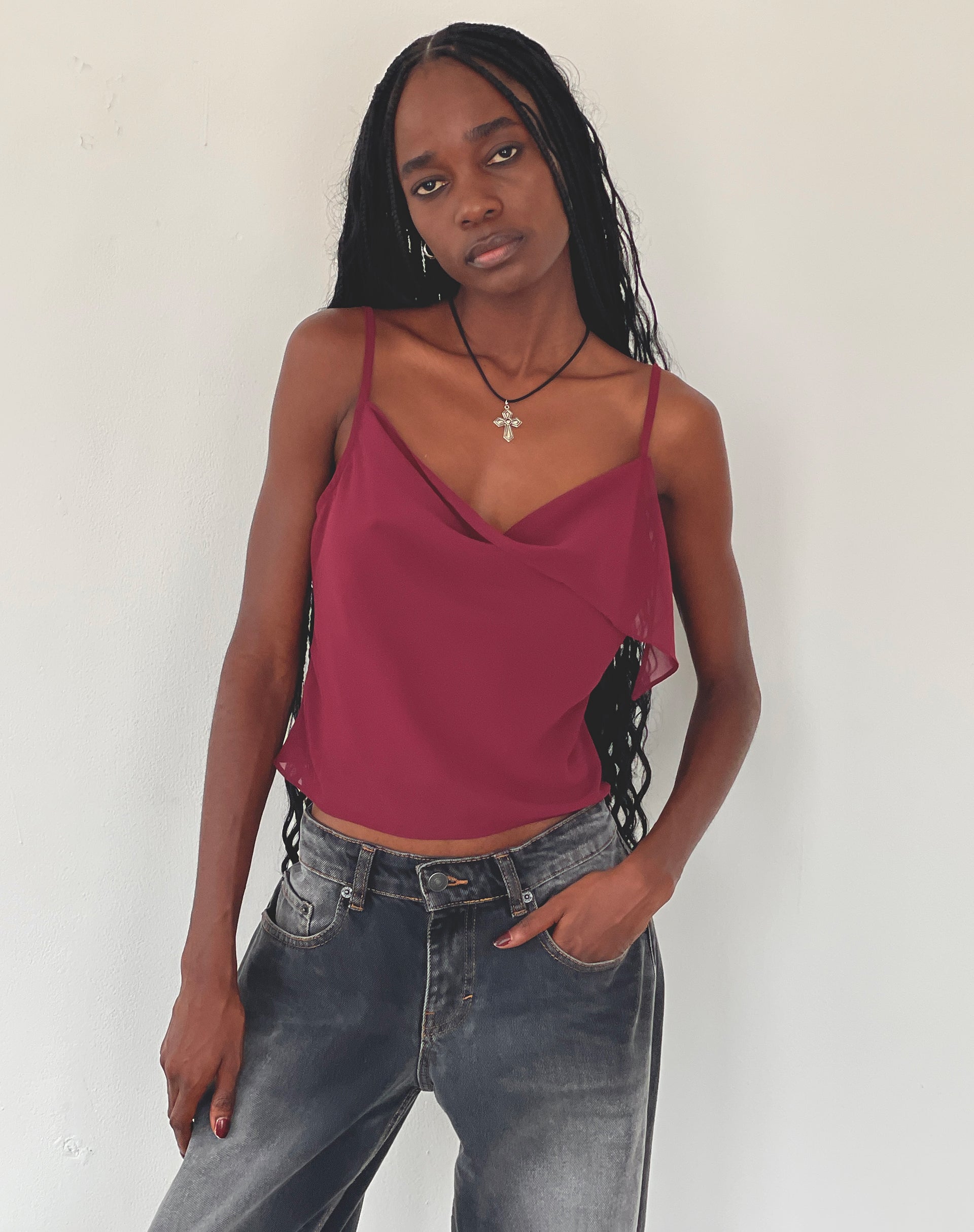 Il Satisha top presenta un ritagliato stratificato, una scollatura quadrata e un materiale in chiffon color prugna. Da abbinare al nostro Roomy in grigio usato candeggina.
