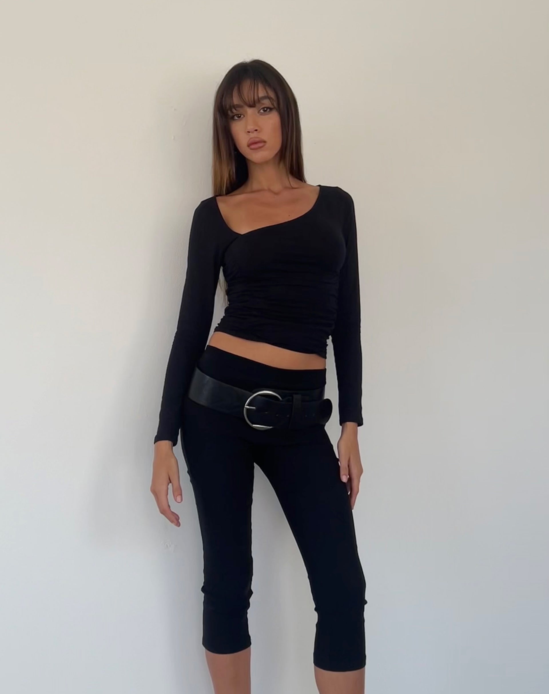 Dare le basi un aggiornamento con il nostro Sunbee top. In nero, con maniche lunghe con vestibilità bodycon, scollatura asimmetrica e dettagli del corpo increspati. Da abbinare ai Shine Capri in nero per una vestibilità perfetta.