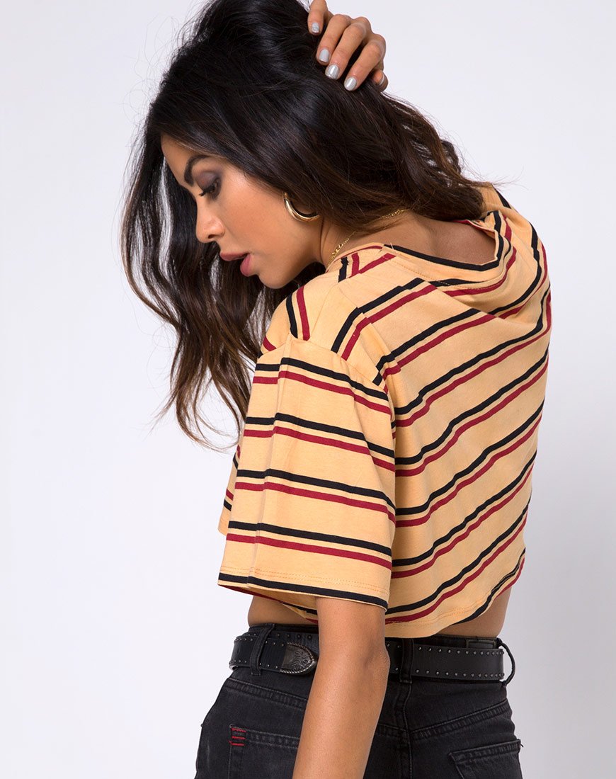 La linea primaverile è arrivata e noi ci siamo buttati su un ritorno agli anni '70 con la t-shirt super cropped. A righe orizzontali senape, presenta un taglio oversize con maniche lunghe. Non siate noiosi in questa stagione e abbinatela a una gonna in denim colorata e a un grazioso zainetto.