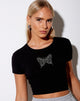La nostra t-shirt Tiney è un top per essere casual. Con un taglio corto, presenta una scollatura a girocollo, maniche corte e base nera con farfalle argentate. Noi l'abbiamo abbinata a un jogger e scarpe da ginnastica pesanti.