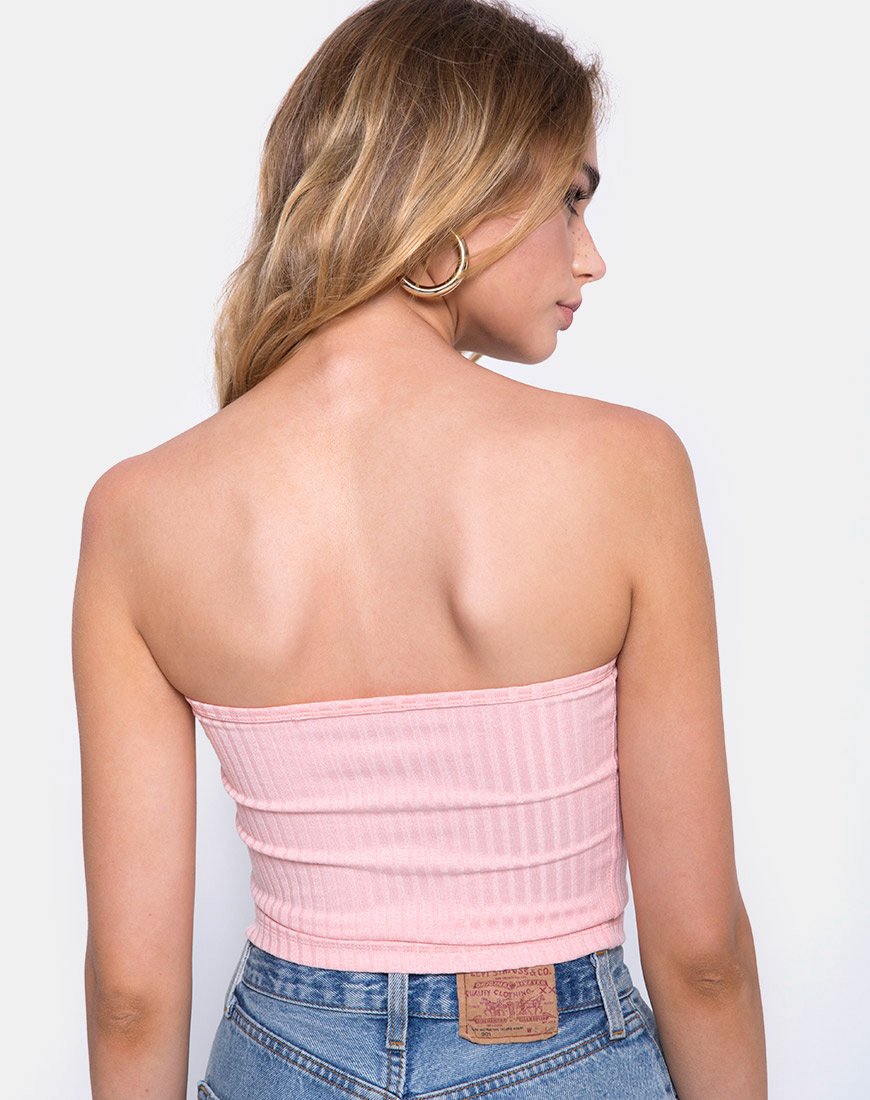 Le tonalità pastello daranno al vostro look una finitura fresca e chic e vi prepareranno all'estate. Date un tocco di classe al vostro look con il top a tubo, in un blush a coste, caratterizzato da una vestibilità cropped bodycon con scollatura a fascia. Noi amiamo completarlo con denim bianchi e scarpe da ginnastica fresche.