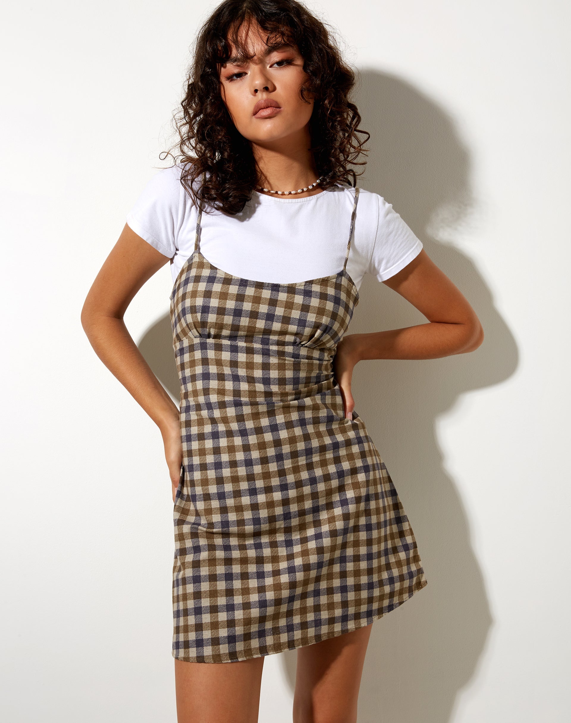 Ottenete la vostra stampa con l'abbronzatura a quadri anni '40. Il vestito Valy abitocon stampa marrone e blu, è caratterizzato da una linea a mini con scollatura a pallina e spalline sottili. Da abbinare al blazer blazer Saken e lo stivale militare.