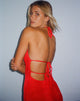 Maxi abito caratterizzato da un design a collo alto e increspato, in lycra rossa.